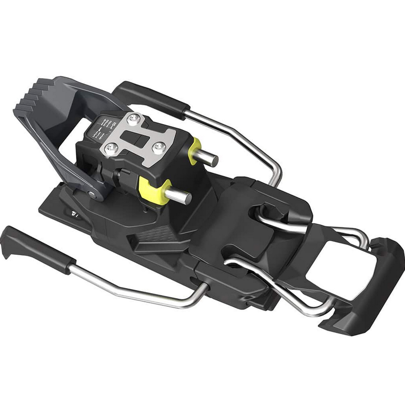 Hinten sorgt die extrem breite Abstützung der Ferse für eine präzise Führung der Ski. Während der Abfahrt stellt die hohe Elastizität für den Ski über einen Längenausgleich von 10 mm die zuverlässige Auslösung gemäss den eingestellten Kräften sicher.