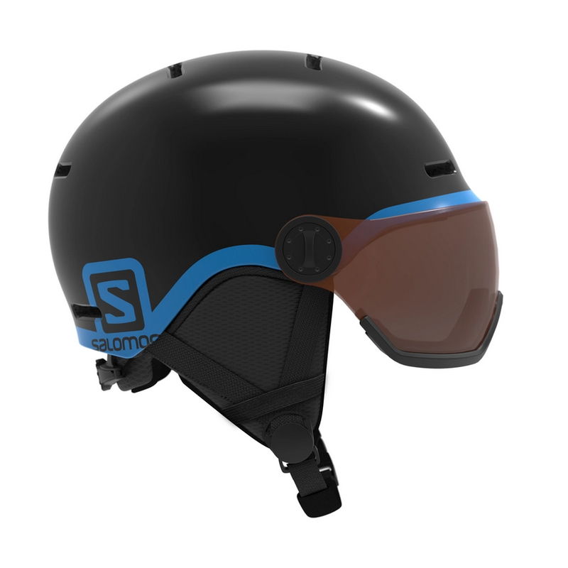 Der neue Salomon Grom Visor Helm bietet kleinen Skifahrern bequeme Handhabung und Schutz. Die morgendliche Suche nach der Skibrille fällt endlich weg.