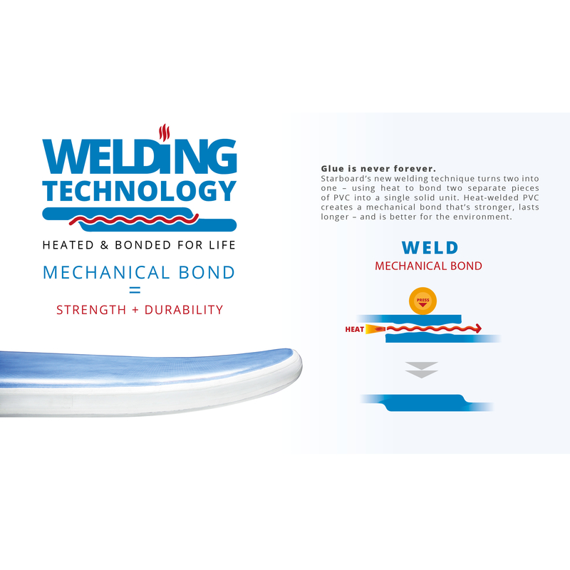 Seit 2019 produziert Starboard alle Inflatables mit laminierten Rails (Kanten). Das bedeutet, die PVC-Lagen werden mit einer neuen Technologie zu einer Lage verschweißt. Im Gegensatz zu handelsüblichen geklebten Rails sind die geschweißten von Starboard deutlich langlebiger, umweltverträglicher und leichter.